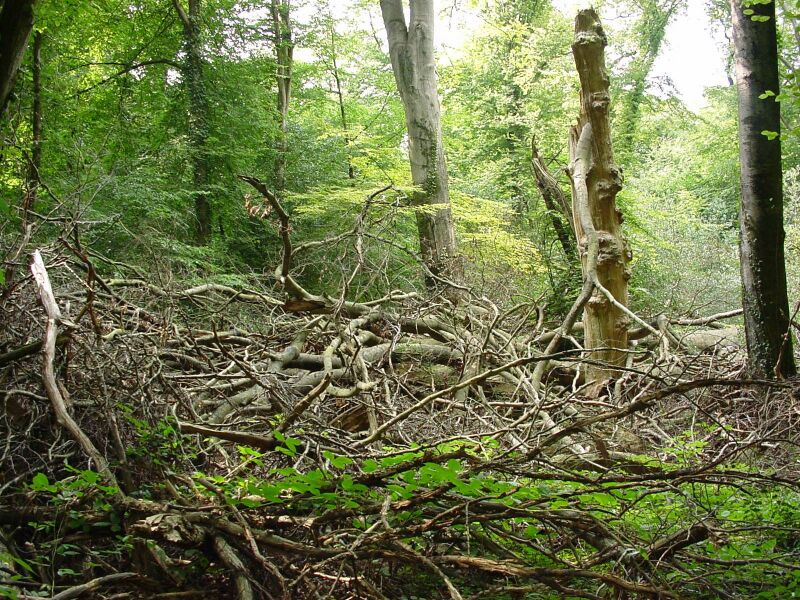 Bis zu 600 Jahre alte Baumriesen - vornehmlich Eichen Buchen - stehen kreuz und quer und stützen sich gegenseitig; abgestorbene Stämme und Äste ragen wie Märchengestalten aus dem dichten Unterholz, (llex) bilden. Mitten im Urwald ist die "Jagdhütte" zu finden , die den Waldbesuchern lange Jahre als Raststätte zur Verfügung stand. Zurzeit steht sie ungenutzt da und blickt einer ungewissen Zukunft entgegen.